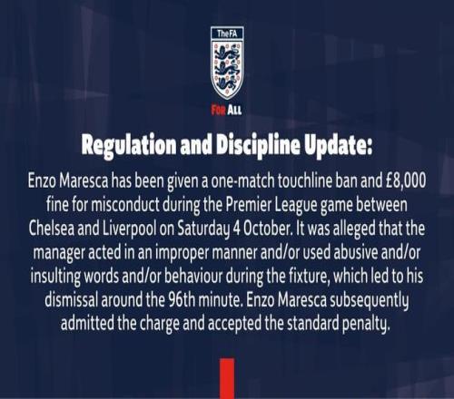 北京时间10月15日,英足总官方发布公告,公布了对马雷斯卡的处罚措施,后者在对阵利物浦的比赛中被红牌罚出场外。