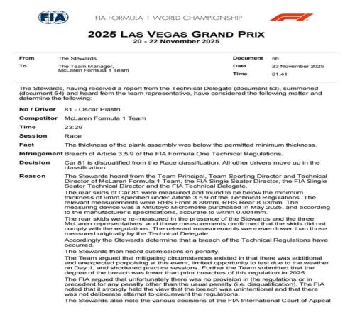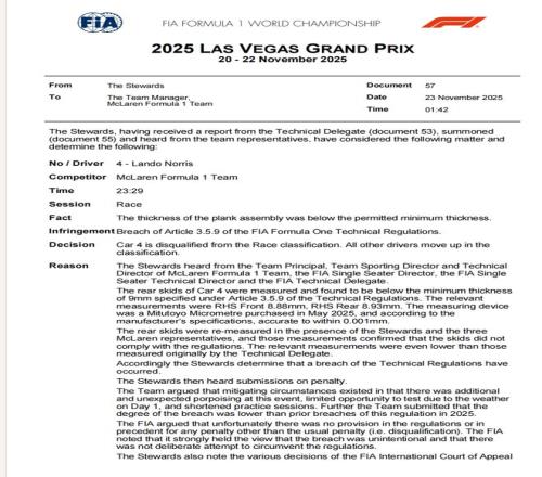 2025赛季F1拉斯维加斯大奖赛正赛刚刚结束,麦克拉伦便遭遇晴天霹雳!国际汽联赛后发布公告称,由于诺里斯和皮亚斯特里的赛车底板磨损测量厚度未达到技术规则要求的最小厚度(9毫米),因此二者均被取消拉斯维加斯站正赛的比赛成绩。 文件指出,诺里斯和皮亚斯特里赛车底部木板右侧前端剩余8.88mm,右侧后端剩余8.93mm,均小于9mm的最低标准。麦克拉伦的解释是这周出现了意料之外的海豚跳现象,降水和红旗意味着车队也没有什么测试重油长距离的机会,并且双车违规的量都比此前类似案例更小。 然而FIA认为,无论是规则还是先例里,都没有除了DSQ之外的其他处罚措施。FIA同时相信,麦克拉伦此次技术违规并非故意。 在诺里斯和皮亚斯特里的本站积分归零之后,诺里斯依旧在2025赛季车手积分榜上以390分位居第一,皮亚斯特里和本站收获冠军的维斯塔潘同积366分并列第二。 本赛季F1还剩余两站赛事,分别为卡塔尔站和收官战阿布扎比站,考虑到卡塔尔站拥有冲刺赛,因此本赛季还有58分可拿。 在现如今仅24分的分差之下,麦克拉伦车队若还想让自己的两位车手登顶年度车手总冠军,则已没有任何犯错的余地。其身后的维斯塔潘从今年9月的意大利蒙扎开始已狂揽4个分站冠军(蒙扎、阿塞拜疆、奥斯汀、拉斯维加斯),积分差距也从今年最大的88分追近到现在的24分,剩余两站比赛麦克拉伦稍有闪失,那维斯塔潘就将距离自己的第五个年度车手总冠军更进一步! 好戏,开场! |