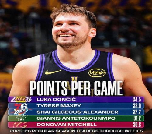 与爵士一战,东契奇出战40分10秒,投篮24中10,其中三分12中3,罚球12中10,得到33分11篮板8助攻3抢断6失误,正负值+5。 11月25日,NBA官方更新了新赛季前五周的场均得分榜、总得分榜。 场均得分榜: 1、东契奇:34.5分 2、马克西:33分 3、亚历山大:32.2分 4、字母哥:31.2分 5、米切尔:30.8分