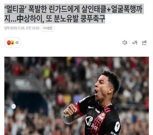 文章最后一段写道,刚实现中超三连冠的上海海港(目前亚冠仅积1分)在亚冠精英赛中却遭遇三连败,跌至12支参赛球队的垫底位置,赛后,球队竟在主场球迷面前举行了中超夺冠的庆祝仪式,引发球迷强烈不满,纷纷指责球员“输成这样还笑得出来?脸呢!” 另一韩媒发文标题大意是:林加德梅开二度却遭凶铲+面部暴力,上海再演惹怒功夫足球(下图)。文章批评张琳芃的危险凶铲有可能导致林加德受伤。