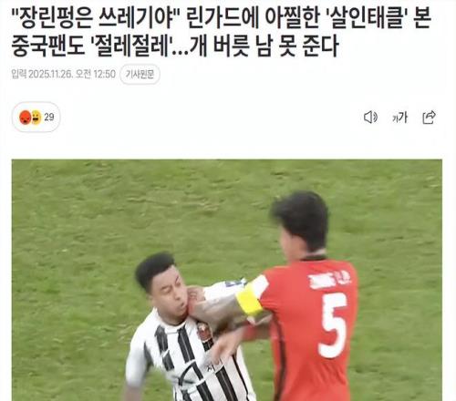 韩媒对张琳芃给林加德的凶铲进行了狠批,标题大意是林加德险遭凶狠飞铲,连中国球迷看了都直摇头。文章配图有两张图片,一张是张琳芃手推林皇面部(上图)标,另一张是飞铲时的镜头(下图)。 谈到张琳芃的粗暴飞铲,该文还举例2012年的亚冠联赛中他对当时全北现代后卫赵城焕恶意飞铲,导致后者重伤。文章继续表示,在中超他以联赛夺冠次数最多(11次)而闻名,但同时也因屡教不改的非绅士化比赛作风而扬名。