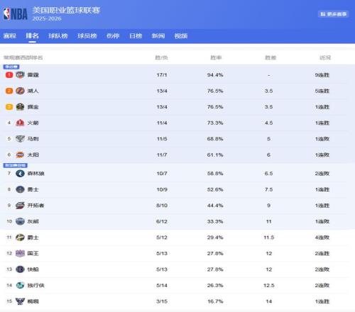 西部3队抢第2! 西部的雷霆队独占鳌头,以17胜1负的战绩位列西部第1位,且领先着第2的湖人3.5场胜负差,球队本赛季的目标直冲70胜,乃至勇士的纪录73胜! 西部第2的争夺就激烈多了!湖人13胜4负,掘金13胜4负,火箭11胜4负,3队之间的胜负差只有1场,都有拿下第2的可能!