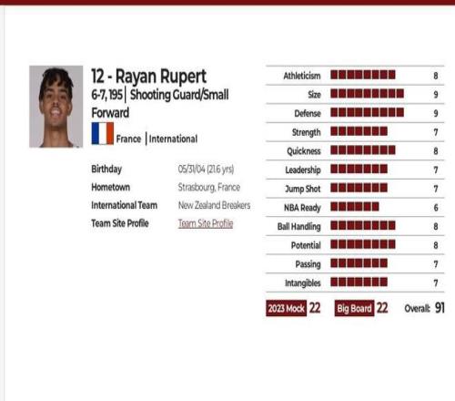 2022-23赛季吕佩尔在NBL联赛新西兰破浪者队担任替补,场均出场19.7分钟得到6.6分2.5篮板1助攻数据,球队获得常规赛第2名,在季后赛阶段打进决赛,最终输给悉尼国王队获得亚军,吕佩尔打出了一些选秀声望,赛季结束报名参加NBA选秀. 我放上他当初的选秀报告,NBA draft 网站选秀综合评分91分,预计选秀顺位首轮21-22顺位(实际次轮总第43顺位被选中),在Size尺寸和Defense防守方面评分9分非常出色,在NBA Ready准备方面6分非常不足,选秀模板OG阿奴诺比,网站评语如下: