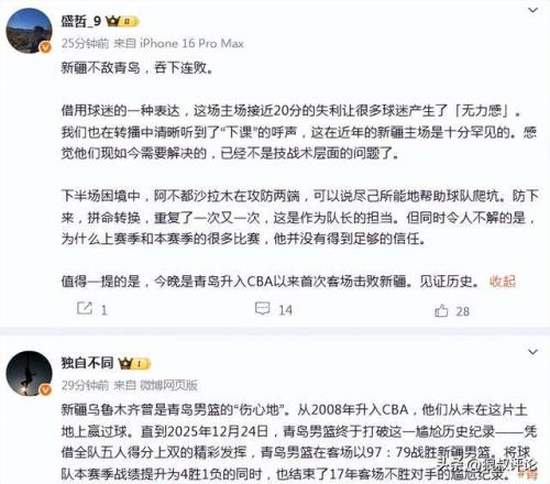 青岛男篮从2008年升入CBA,他们从未在新疆男篮主场赢过球。直到2025年12月24日,今晚终于打破这一尴尬历史纪录。