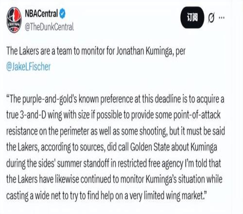 北京时间1月13日,据名记Fischer报道,湖人是密切关注库明加的球队之一,有美媒列出了湖人3换1得到库明加的交易方案。