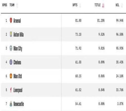 当然,虽然外界对于阿森纳目前的境遇都感到悲观,但毫无疑问AI对于阿森纳本赛季夺冠的前景还是非常看好的,据知名数据网站Opta预测,英超联赛23轮比赛结束后,英超夺冠的概率中,阿森纳依旧以81.28%概率断崖式的排在第一位,而排在第二位的阿斯顿维拉,仅仅只有9.52%的概率,而曼城则只有9.01%的概率。所以,阿森纳球员和球迷真的没必要过于悲观,毕竟目前主动权还在自己手中。 |