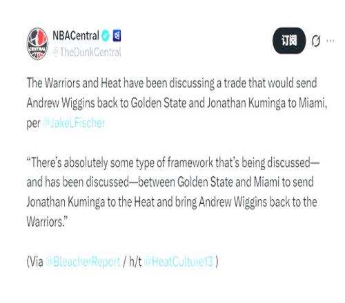 北京时间1月28日,NBA交易市场的流言焦点再度聚焦于金州勇士与迈阿密热火身上。据名记Fischer最新报道,两队关于锋线球员的交易谈判已进入实质阶段,一套以库明加换维金斯为核心的3换1交易框架正在逐步成型。交易流言的发酵并非偶然。早在此前,名记Stein就曾披露勇士有意通过交易库明加换回旧将安德鲁·维金斯,如今这一设想已从探讨走向实操。早在1月16日库明加主动递交的交易申请,不过随后巴特勒遭遇伤病,科尔不得不重新启动库明加,尽管复出的两场表现不俗,但是很快遭遇了伤病,而库明加本人的离队诉求始终未变,这无疑让勇士管理层加快了交易谈判的进程。