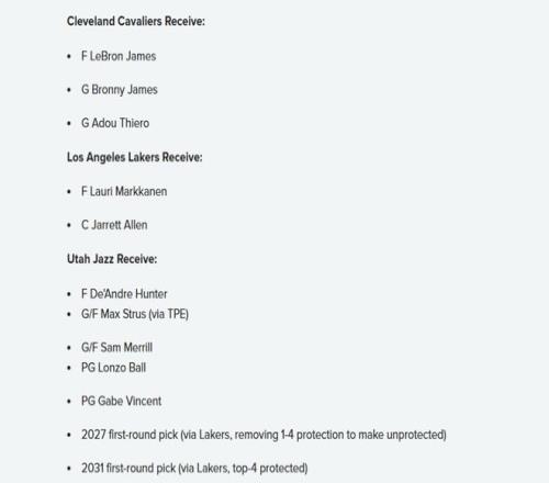 潜在交易方案如下 骑士得到:詹姆斯+布朗尼+蒂耶罗; 湖人得到:马尔卡宁+贾勒特-艾伦; 爵士得到:亨特+斯特鲁斯+梅里尔+鲍尔+文森特+2027年湖人首轮(取消前四保护,成为无保护首轮)+2031年湖人前四保护首轮。