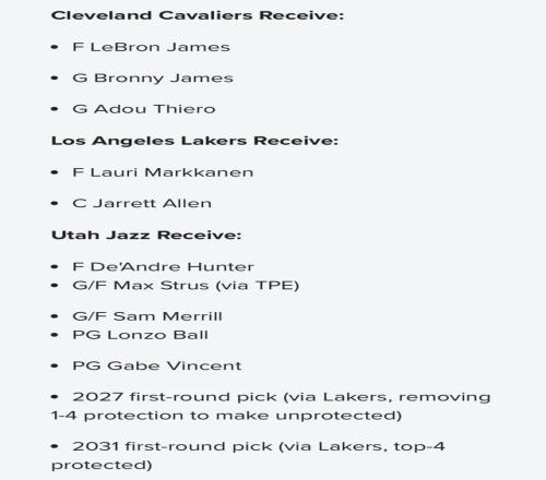 今日,知名体育媒体Bleacher Report抛出了一套极具冲击力的方案,詹姆斯三方交易,湖人、骑士、爵士全员上桌,交易细节如下: 骑士得到詹姆斯+布朗尼+蒂耶罗; 湖人得到马尔卡宁+阿伦; 爵士得到亨特+斯特鲁斯+梅里尔+鲍尔+文森特,附加27年湖人首轮(取消前4顺位保护),31年前4顺位保护首轮。